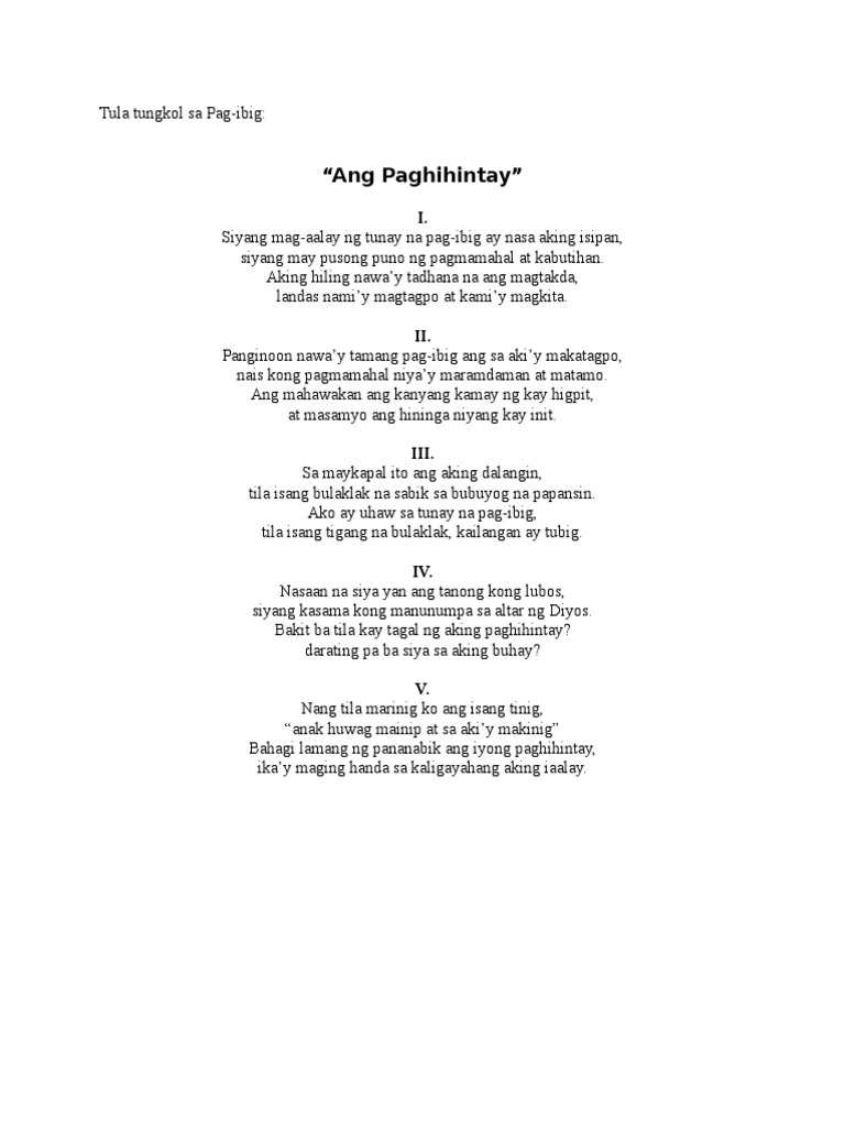 Read Ang Pag-ibig ng Diyos sa Atin from the story Tula by Hannaheart Chonna Sulit Noay with 41152 reads. May ibang may tahanan ngang naturingan Ngunit tinig ay bahaw na sa labis na kagutuman Amat inay walang tiyak na pagkukunan Pusoy nawawasak tuwing bunsoy pinagmamasdan. Sukat bilang ng pantig sa bawat taludtod ng isang tula.