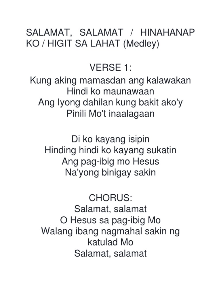 Salamat Salamat Oh Hesus sa Pag-ibig Mo Akoy magsasaya sa piling Mo Verse 2 Kung may pagsubok man o kagipitan Ako ay may lalapitan Ikaw HESUS ang aking sandigan Hindi mo ko pababayaan refrain chorus Bridge Buhay ko na ang purihin Ka Buhay ko na ang sa Yoy sumamba Wala ng ibang nanaisin pa kundi pasalamatan Ka. O Hesus sa pag-ibig Mo. Di ko kayang isipin Hinding hindi ko kayang sukatin Ang pag-ibig.